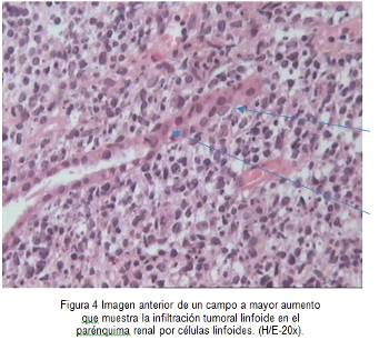 Considerando a los linfomas como neoplasias malignas, originadas en los ganglios linfáticos o en el tejido linfoide de los distintos parénquimas, teniendo en cuenta que el parénquima renal carece de tejido linfoide, no es de extrañarse que se cuestione la existencia del linfoma renal primario como entidad propia 6. Para ello se señalan los criterios de Malbrain 7 que son: 1) Insuficiencia renal aguda como manifestación inicial 2) Nefromegalia bilateral sin obstrucción y sin afectación de otros órganos 3) Diagnóstico por biopsia renal 4) Ausencia de otras causas de insuficiencia renal aguda, y 5) Recuperación rápida de la función renal tras la quimioterapia. La mayoría de estos criterios observados en la paciente.
